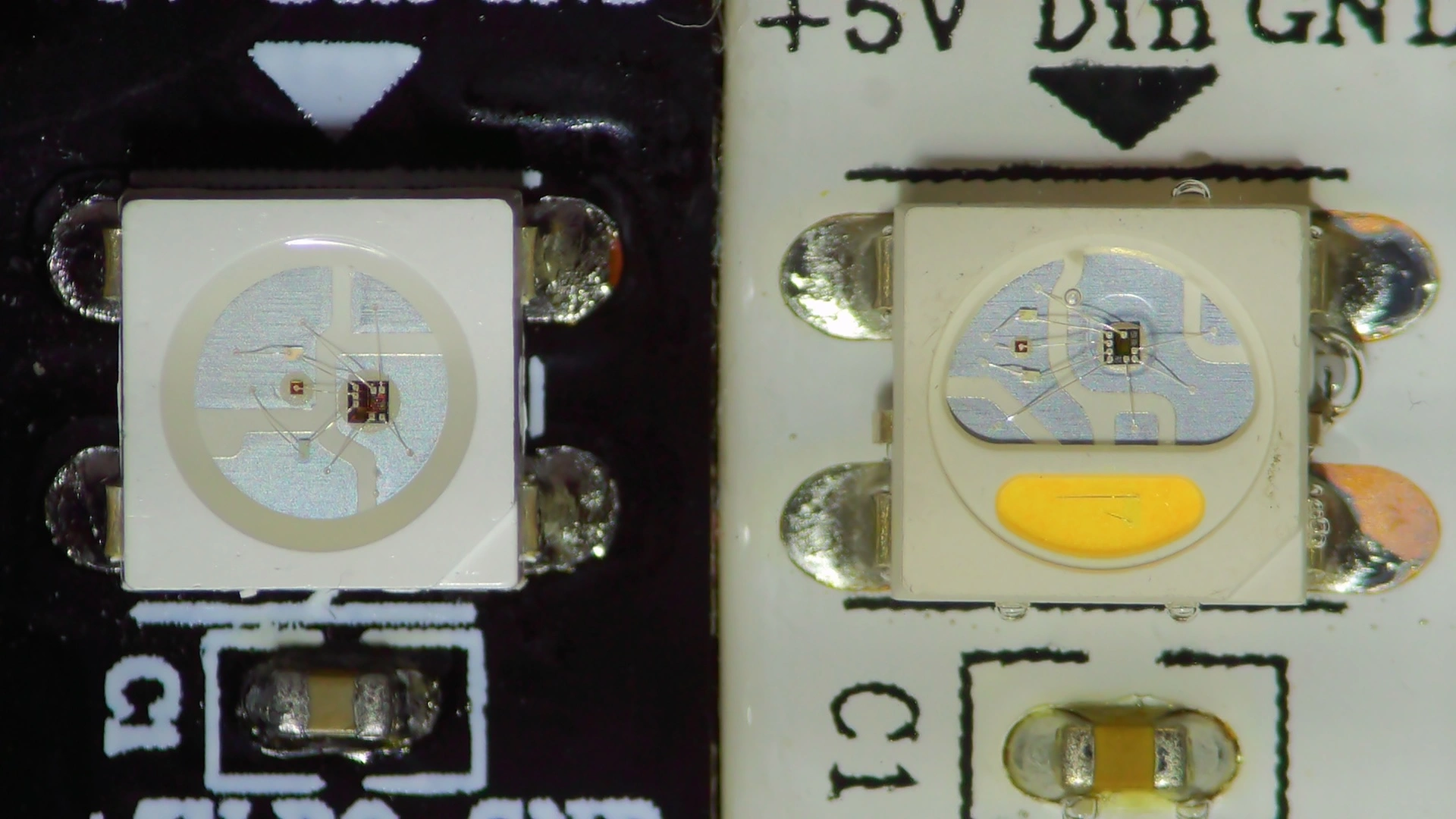 Microscope view of WS2812B (left) and SK6812 (right). Both feature three RGB LEDs sharing a common anode on the left with the controller on the right. The SK6812 also has a white LED at the bottom with two visible wires