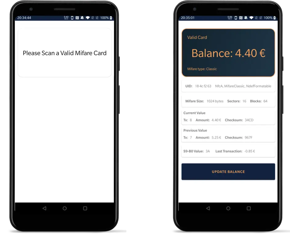 The final application is able to read NFC cards, identifying the exact model and properties (NfcA, NdefFormatable, etc...) before checking from a list of pre-approved UIDs used to validate the card. If the card passes validation, its contents are parsed and displayed. A user can set a new arbitrary amount as the card balance and the application takes care of the CRC calculation before updating it.